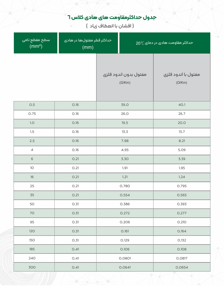 جدول حداکثر مقاومت هادیهای کلاس۶ (افشان با انعطاف زیاد)