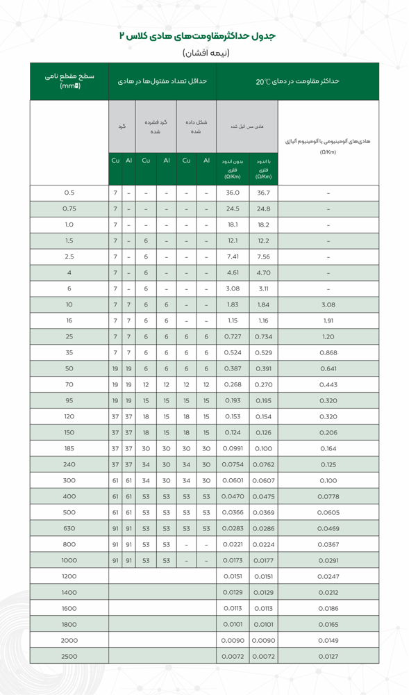 جدول حداکثر مقاومت هادیهای کلاس ۲ ( نیمه افشان)
